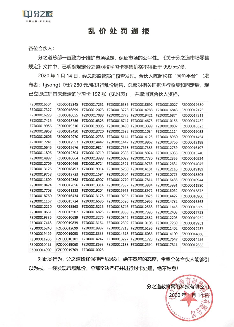分之道对市场乱价的行为,始终保持严厉惩罚,绝不宽恕的处理态度。